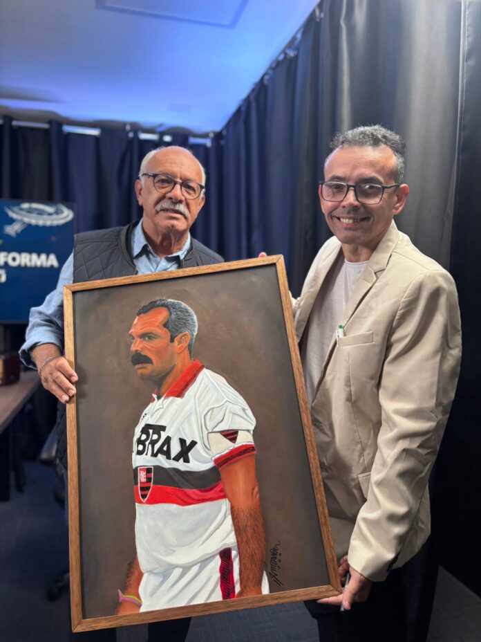 Ao chegar a Suderj, Raquel foi logo tirando uma foto, pedindo autógrafo e revelando que ele (Junior) é, para ela, o maior ídolo do Flamengo. Maior até do que Zico.